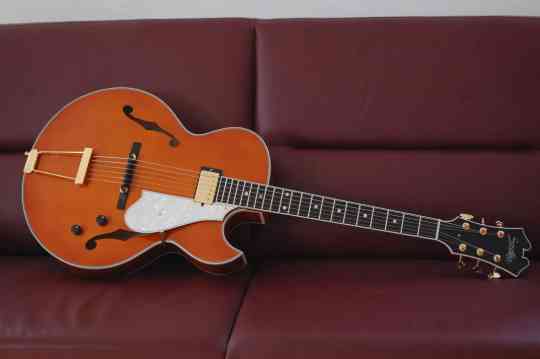 Der Tonabnehmer produziert den fetten, warmen Ton, typisch für Archtops. Die spezielle Deckenkonstruktion der Brigit-Bauweise gibt dem Klang aber noch einen schönen, akustischen Anteil, der dem Ton Transparenz verleiht.